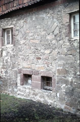 Auf der Süd- und Ostseite findet man ein Mauerwerk aus zum Teil unbehauenen Sandsteinen mit mehreren vermauerten Öffnungen. Der historisch bedeutenste Teil, der Rückschlüsse auf das Alter zulässt, ist der vermauerte kleine Eingang auf der Südseite, über dem ein halbkreisförmiges Tympanon als Türsturz liegt. Darin eingehauen ein fächerförmiges Kreuz auf Felspartie. Ein ähnliches Tympanon mit dem gleichen Kreuz findet man noch an der Kirche in Ölshausen. Links und rechts des Eingangs befinden sich auf den Steinen tiefe Kratzspuren, die unterschiedliche Deutung zulassen. Es gibt Behauptungen man habe dort Messer und Schwerter gewetzt, um etwas von dem heiligen Ort auf diese zu übertragen. Ein andere Deutung ist, dass man Gesteinsstaub herausgekratzt hat, um diesen als Heilmittel zu nutzen. Heute sieht man nur noch im unteren Bereich das mittelalterliche Mauerwerk, welches im Grundmauerbereich bis zu 1 m dick ist. Der obere Bereich wurde durch ein Fachwerk ersetzt. Wie dieser Bereich früher ausgesehen hat, kann man heute nicht mehr nachvollziehen. Dieses Gebäude wurde offensichtlich über die Jahrhunderte immer wieder als Scheune benutzt, wovon auch der auf der Ostseite vorhandene zugemauerte große Torbogen zeugt.