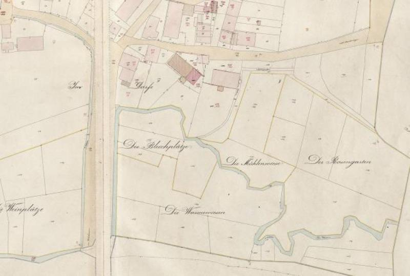 Diese Gemarkungskarte birgt eine besondere Überraschung. Zeigt sie doch, dass der heutige Verlauf der Warme nicht dem von 1876 enspricht. Heute verläuft die Warme fast gradlinig vom Rosengarten zum Durchfluss unter der Bundesstraße. Wie man dieser Karte entnehmen kann, erreichte die Warme nach einem sehr unregelmäßigen Verlauf fast die Gebäude im Mühlenweg, um dann von dort gradlinig nach Westen zu streben, dann unterhalb des heutigen Friedhofs mit der Erle zusammenzufließen und erst von dort ihren Weg nach Norden, entsprechend dem heutigen Verlauf, fortzusetzen. Insoweit sind noch einige Untersuchungen notwendig, zu klären, an welchen der drei Gebäude im Mühlenweg ( Hausnummer 18, 17 und 16 1/2), zu welcher Zeit eine Mühle betrieben wurde.