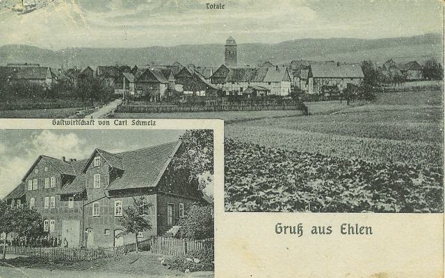 Postkarte aus Ehlen 1903 mit Ortsansichten und Blick nach Burghasungen