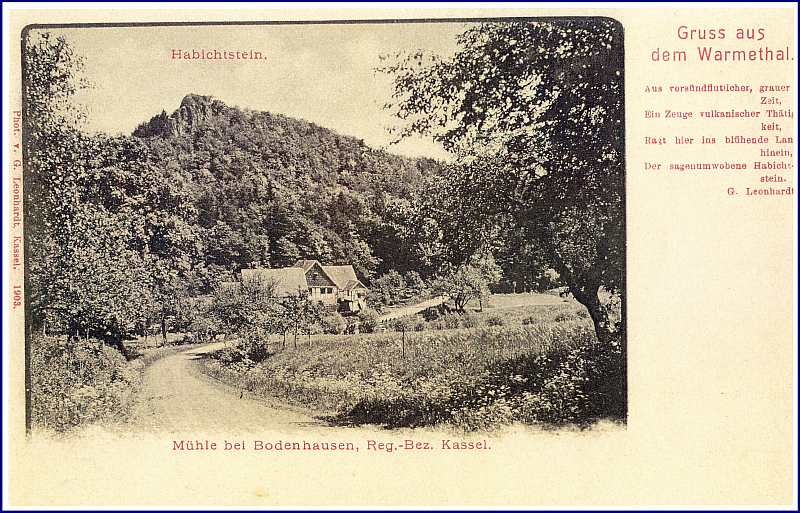 Die Habichtsteiner Mühle an der alten Landstraße. Daruber der imposante Habichtstein.